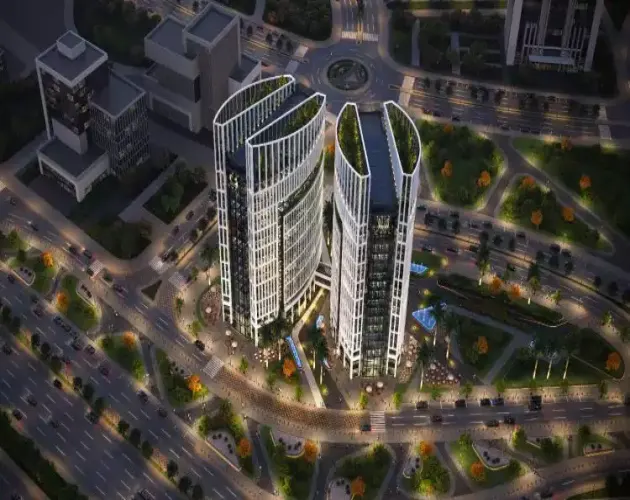 لقطة جوية ليلية لمشروع Eval Towers توضح روعة التصميم والإضاءة الحديثة