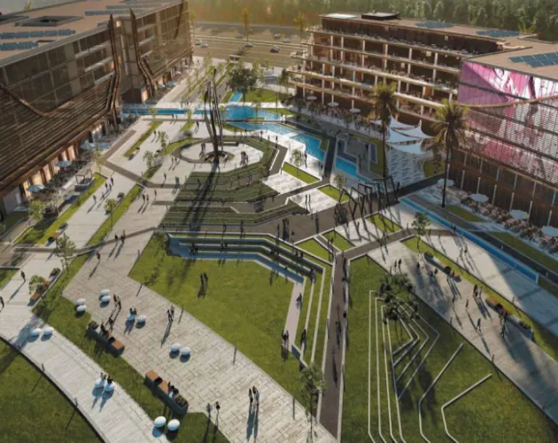 - منطقة مخصصة للفعاليات الخارجية تشمل مدرج روماني ونوافير جذابة ومساحة للتزلج.